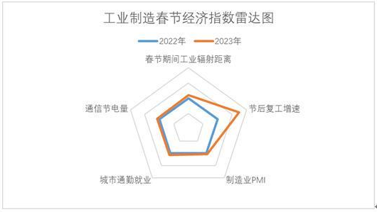 防疫优化调整和疫情达峰回落,为春节期间经济恢复创造了条件,全国人口流动性的显著提升,多项产业释放积极信号。我们综合分析工业制造、信息服务、商业零售、农村农业、旅游交通五大行业数据,春节经济指数较2022年春节期间同比增长5.2%,五大行业指标均有提升,综合经济水平积极向好,迎来强劲复苏。